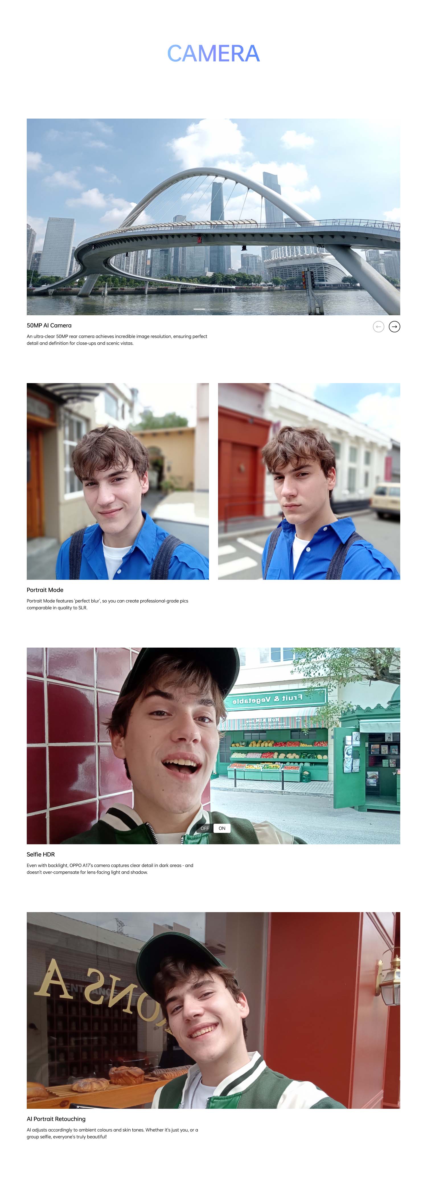 Equipped with 50MP Camera, OPPO A17 provides an awesome portrait shooting experience for photography enthusiasts. Users can capture high-quality images with various imaging features, such as 360° Fill Light, Portrait Retouching, HDR and more.